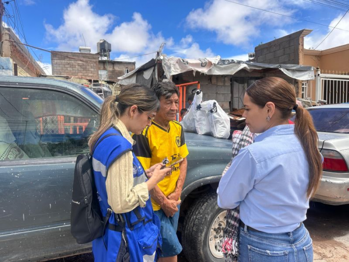 Chihuahua, Chih.- Ante la contingencia derivada por las fuertes lluvias e inundaciones, la presidenta del DIF Municipal, Karina Olivas, junto a cuatro brigadas, brindan atención a familias afectadas de las colonias El Porvenir, Los Minerales, Nuevo Triunfo y Antorcha Popular.