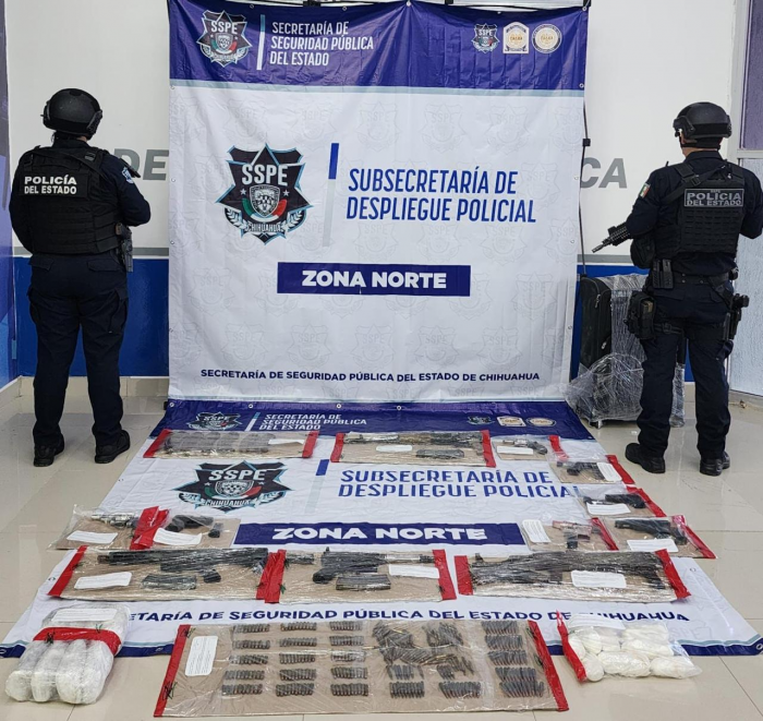 Chihuahua, Chih.- Derivado de un operativo realizado la noche del pasado martes, elementos de Despliegue Policial de la Secretaría de Seguridad Pública del Estado (SSPE), aseguraron un importante arsenal, así como una cantidad considerable de drogas en la colonia Kilómetro 29.El hallazgo se registró a las 23:58 horas en las inmediaciones de las calles Grano de Oro y Nico Pérez, donde fue localizada una maleta negra la cual contenía: 11 armas de fuego, entre ellas 7 cortas y 4 largas, pistolas de diferentes calibres y fusiles de alto poder.