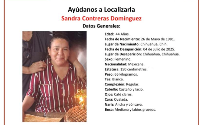 Chihuahua, Chih.- Una mujer de 44 años identificada como Sandra Contreras Domínguez fue reportada como desaparecida tras haber sido vista por última vez en la colonia Progreso. Desde entonces no se tiene conocimiento sobre su paradero.Al momento de su desaparición vestía pantalón de mezclilla azul oscuro y tenis blancos con rosa. Como señas particulares, tiene un lunar en la barbilla del lado izquierdo y una cicatriz en la rodilla izquierda.