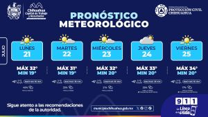 Chihuahua, Chih.- El Gobierno Municipal, a través de Protección Civil, informa que en esta semana se mantiene un pronóstico de lluvias con cielos mayormente nublados, presencia de vientos moderados y con posibles precipitaciones especialmente en las tardes y noches.