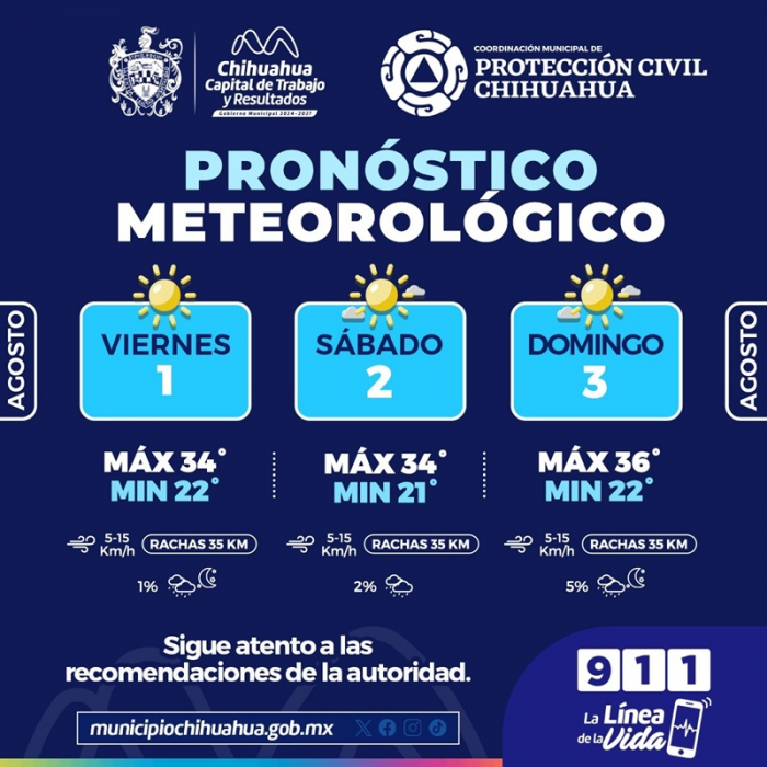 Chihuahua, Chih.- La Coordinación Municipal de Protección Civil de Chihuahua informa que, para este fin de semana del 1 al 3 de agosto, la temperatura máxima alcanzaría hasta los 36°C, por lo que emiten recomendaciones por calor.