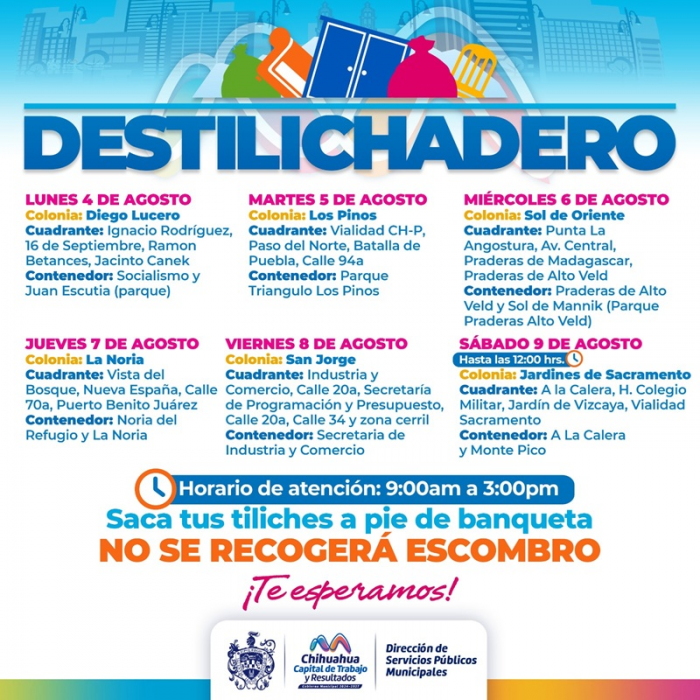 Chihuahua, Chih.- Para evitar acumulaciones de basura de grandes dimensiones en las viviendas, que podría generar plagas o problemas de salud, el Gobierno Municipal, a través de la Dirección de Servicios Públicos Municipales, informa el calendario del programa Destilichadero, que se realizará del 4 al 8 de agosto en seis colonias de la Capital.