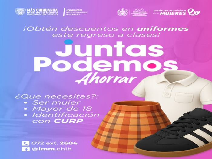 Chihuahua, Chih.- El Gobierno Municipal de Chihuahua, a través del Instituto Municipal de las Mujeres (IMM), invita a todas las mujeres mayores de 18 años a tramitar la tarjeta “Juntas Podemos Ahorrar”, con la cual podrán obtener descuentos exclusivos en uniformes y calzado escolar para este regreso a clases.