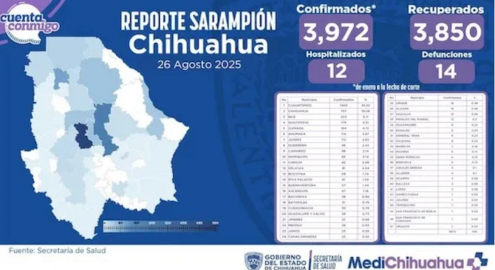 A pocos días del inicio del ciclo escolar en educación básica, Chihuahua enfrenta un brote de sarampión con 3,982 casos confirmados en lo que va del año, de acuerdo con cifras oficiales de la Secretaría de Salud.