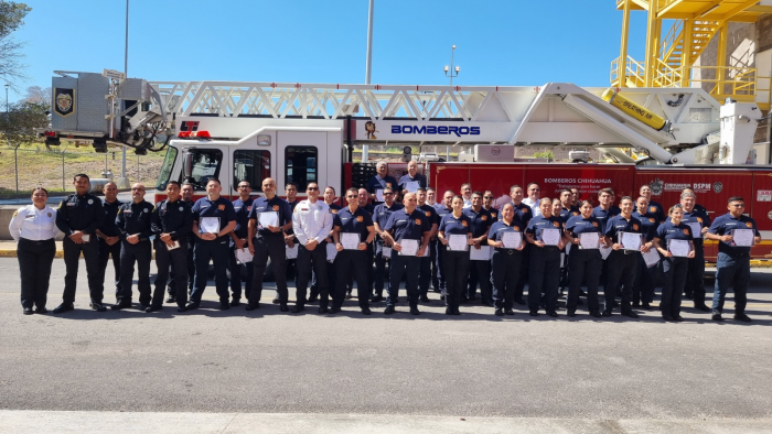 H. Ciudad de Chihuahua, Chih., 1 de septiembre de 2025.-Tras una jornada de capacitación en las instalaciones del Instituto Superior de Seguridad Chihuahua (ISSCUU), el director de Seguridad Pública Municipal, Julio César Salas, encabezó la entrega de constancias a 32 hombres y mujeres como bomberos voluntarios.