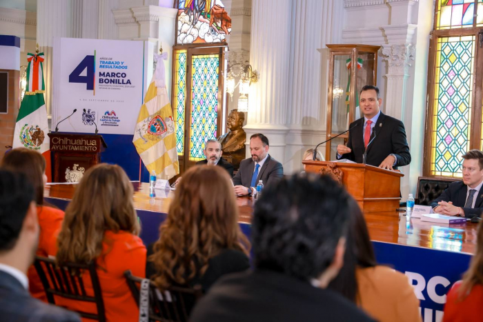 Por FELAH. Ciudad de Chihuahua, Chih. A 4 de septiembre de 2025.- En sesión solemne de Cabildo, el alcalde Marco Bonilla hizo entrega a las y los regidores del Ayuntamiento de Chihuahua el documento de su Cuarto Informe, donde resaltó que los resultados presentados son el testimonio de lo que se puede lograr cuando el gobierno, la ciudadanía y las instituciones trabajan como aliados, no como adversarios.