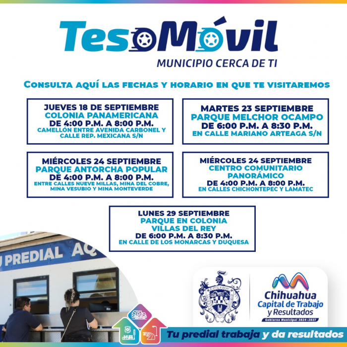 Por FELAH. Ciudad de Chihuahua, Chih.- La Tesorería, informa a la ciudadanía que el Teso Móvil visitará diversos puntos de la ciudad del 18 al 29 de septiembre, esto con el fin de brindar atención a las y los contribuyentes que deseen pagar su Predial, o bien, realizar algún convenio de pago.