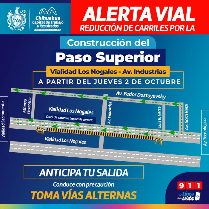 Por FELAChihuahua, Chih.- El Gobierno Municipal a través de la Dirección de Obras Públicas, emite una alerta vial por la reducción de tres a dos carriles en el cuerpo sur de la Vialidad Los Nogales, esto como parte de las actividades previas a la construcción del Puente Superior Vialidad Los Nogales.