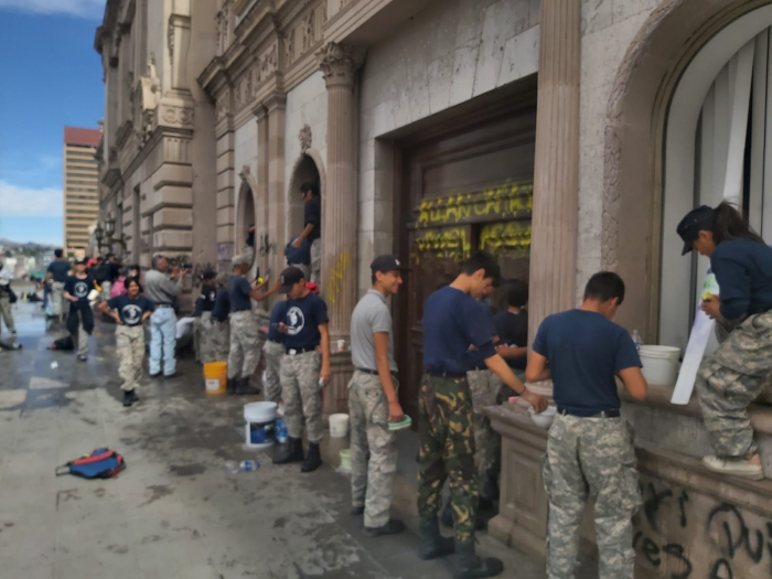 Chihuahua, Chih.- Alrededor de un centenar de jóvenes integrantes de diversas asociaciones juveniles como «Rescate Juvenil», «Legión Lobos» e integrantes de «Cruzada por la Familia A.C.», acudieron esta mañana a la plaza de Armas, y equipados con cubetas, cepillos, agua y jabón comenzaron a colaborar con las acciones de limpieza, luego de los severos daños que provocaron grupos de feministas radicales en la marcha del pasado miércoles por El Día Internacional de la Mujer.