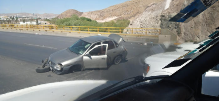 El incidente ocurrió a la altura del kilómetro uno, donde la conductora de un vehículo Chevy, pierde el control en la curva al viajar acceso a velocidad impactando contra la banqueta y el muro de contención quedando el vehículo destrozado a medio carretera.