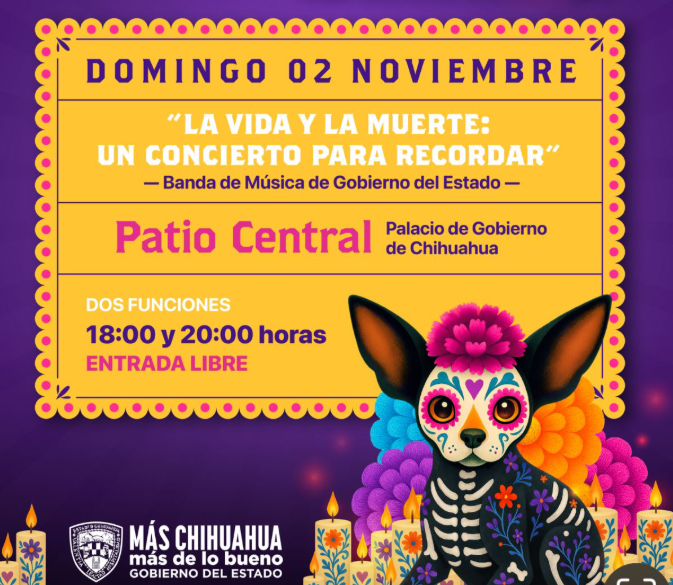 El domingo 2 de noviembre, la Banda de Música de Gobierno del Estado presentará “La vida y la muerte: un concierto para recordar”, también a las 18:00 y a las 20:00 horas.