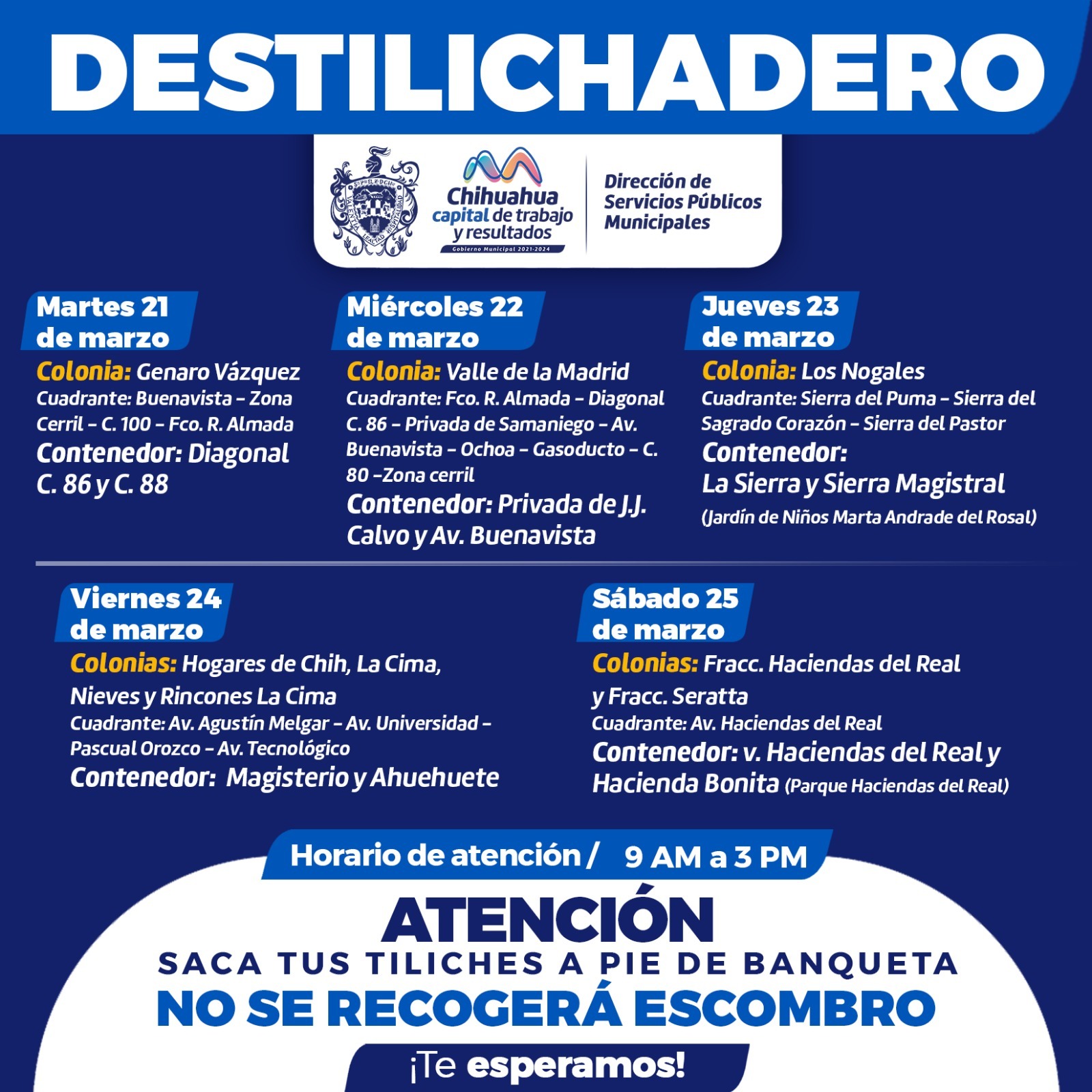 Chihuahua, Chih. A 18 de marzo de 2023.- El Gobierno Municipal de Chihuahua encabezado por Marco Bonilla, a través de la Dirección de Servicios Públicos Municipales, informa a la ciudadanía el calendario del programa Destilichadero que se realizará del 21 al 25 de marzo, en nueve colonias de Chihuahua Capital.