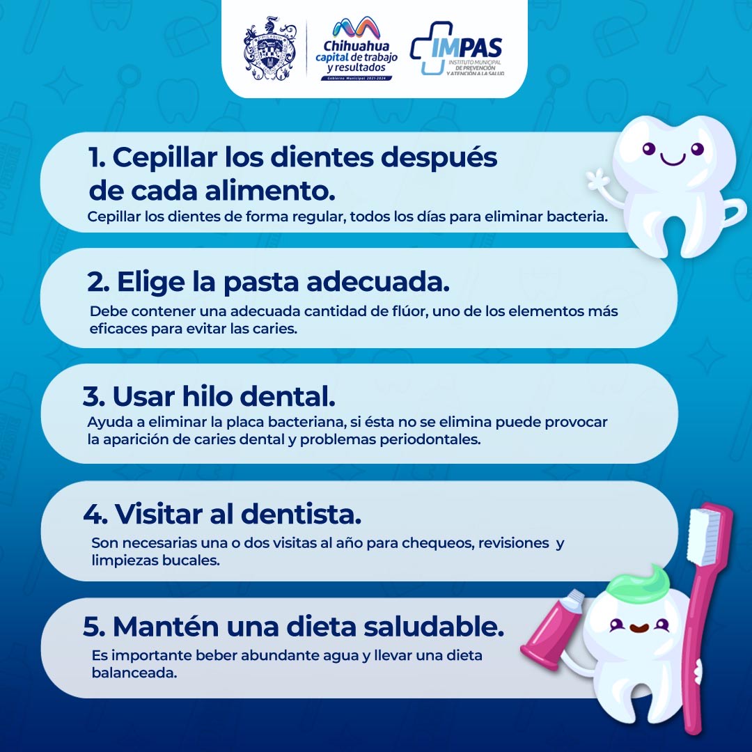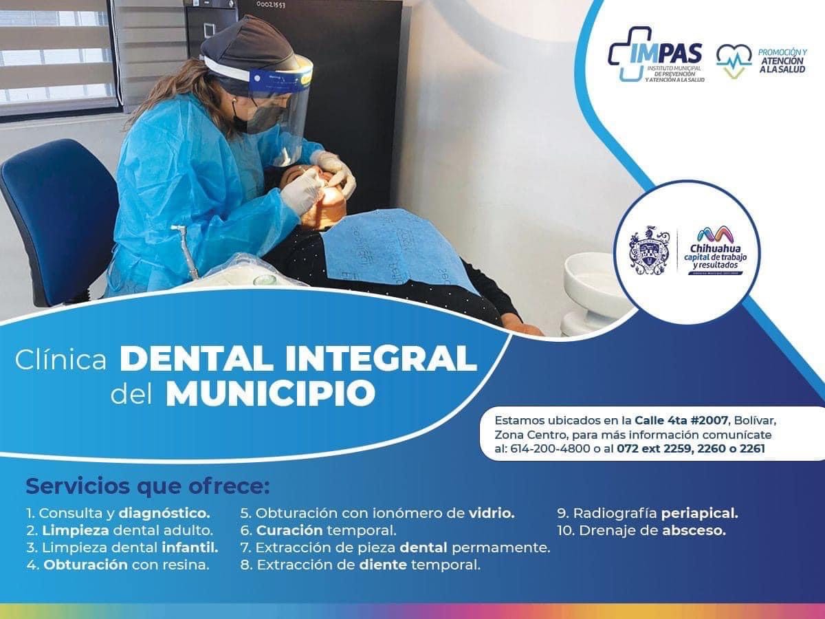 Este 20 de marzo, Día Mundial de la Salud Bucodental, conoce la Clínica Dental Integral del Municipio.Chihuahua, Chih.- En el marco de conmemoración del Día Mundial de la Salud Bucodental, que se celebra este 20 de marzo, el Instituto Municipal de Prevención y Atención a la Salud (IMPAS), reitera los servicios que ofrece en salud dental para el beneficio de las familias chihuahuenses.