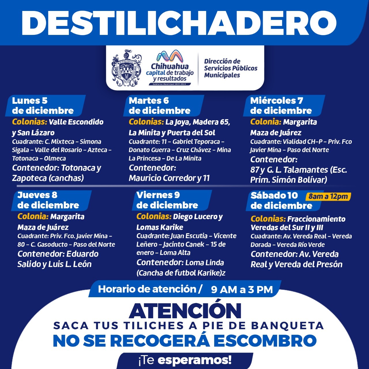 Por FELAChihauhua, Chih.- La Dirección de Servicios Públicos Municipales anunció los puntos donde estará el destilichadero debido a que visitará 11 colonias la siguiente semana y así los chihuahuenses puedan deshacerse de sus tiliches.