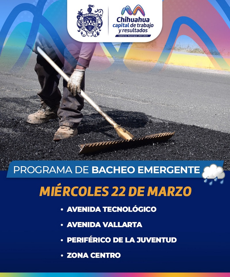 Chihuahua, Chih.- El Gobierno Municipal que encabeza el alcalde Marco Bonilla, invita a las y los conductores a tomar precauciones por los trabajos de bacheo que se realizarán de manera emergente el día de hoy miércoles 22 de marzo en avenidas principales de la ciudad, en atención a los daños ocasionados debido a las lluvias del fin de semana.