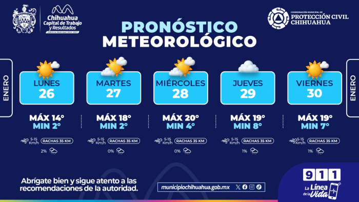 La Coordinación Municipal de Protección Civil informa que, durante la semana del lunes 26 al viernes 30 de enero, se pronostica que continúen las bajas temperaturas con mañanas frías en la ciudad.De acuerdo al Servicio Meteorológico Nacional, para este lunes se prevé una temperatura máxima de 14°C y mínima de 2°C, con cielo mayormente soleado.