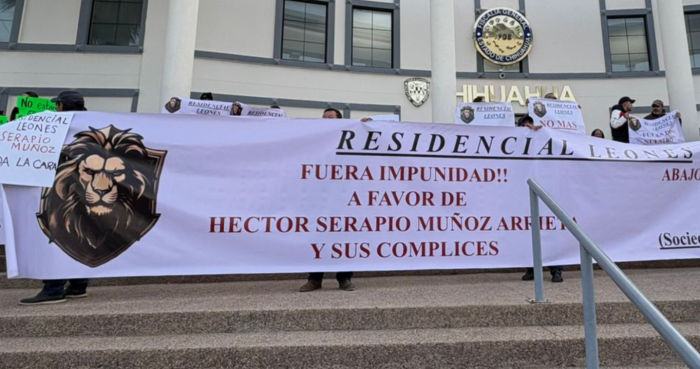 Habitantes del fraccionamiento Residencial Leones, ubicado en Ciudad Aldama, acudieron a las instalaciones de la Fiscalía para exigir que Serapio Muñoz deje de intervenir en la administración del conjunto habitacional.Como parte de la manifestación, los inconformes cerraron la circulación en Paseo Bolívar, en el tramo que va de la calle Independencia a Coronado, utilizando vehículos para bloquear la vialidad y llamar la atención de las autoridades.