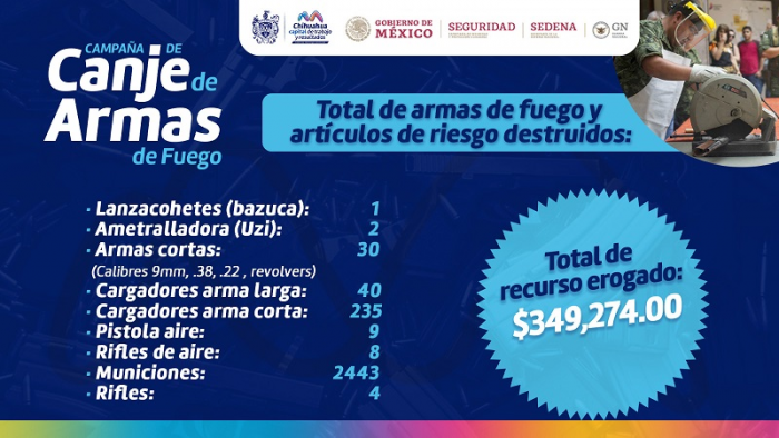 Chihuahua, Chih.- El Gobierno Municipal, que encabeza el alcalde Marco Bonilla, por medio de la Secretaría del H. Ayuntamiento, en conjunto con la Secretaría de la Defensa Nacional (SEDENA), cerró exitosamente el programa “Canje de Armas” 2023, con el objetivo de reducir posibles accidentes, suicidios , homicidios e impactar en los índices de violencia.