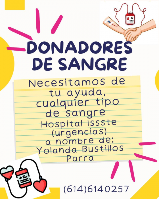 Chihuahua, Chih.- Familiares de Yolanda Bustillos Parra solicitan el apoyo de la ciudadanía para la donación de sangre de cualquier tipo en el Hospital ISSSTE, en el área de urgencias.De acuerdo con la información difundida, se requieren donadores que puedan acudir directamente al nosocomio y registrarse a nombre de la paciente, con el fin de cubrir la necesidad médica.