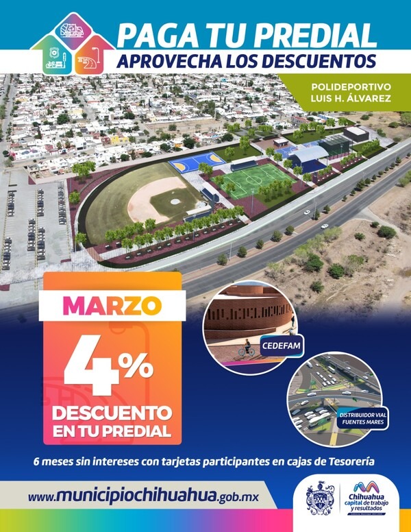Chihuahua, Chih.- En apoyo a la economía de las familias chihuahuenses, como lo ha señalado el alcalde Marco Bonilla, se informa a la ciudadanía en general que queda una semana para aprovechar el descuento del 4 por ciento en el pago del Impuesto Predial, que termina el próximo 31 de marzo.