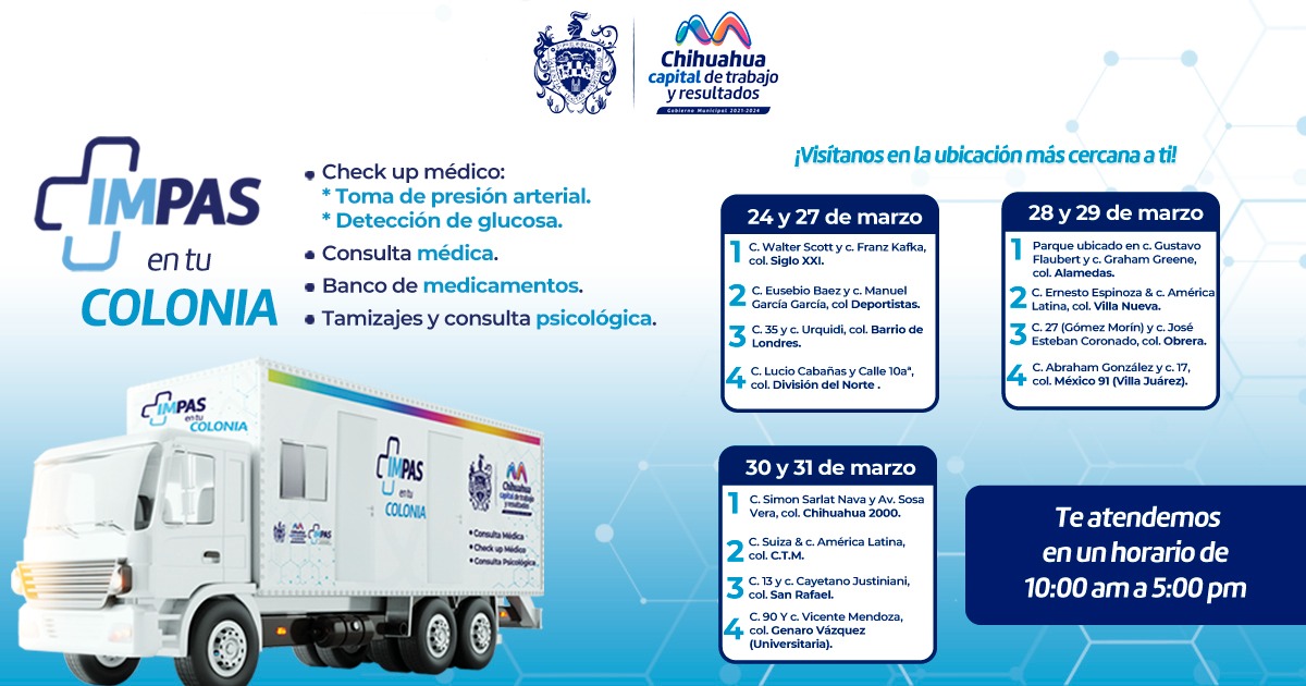 Chihuahua, Chih.- El Gobierno Municipal que encabeza el alcalde Marco Bonilla, a través del Instituto Municipal de Prevención y Atención a la Salud (IMPAS), invita a las familias de la Capital a aprovechar los servicios gratuitos en los Consultorios Móviles del programa “IMPAS en Tu Colonia”.