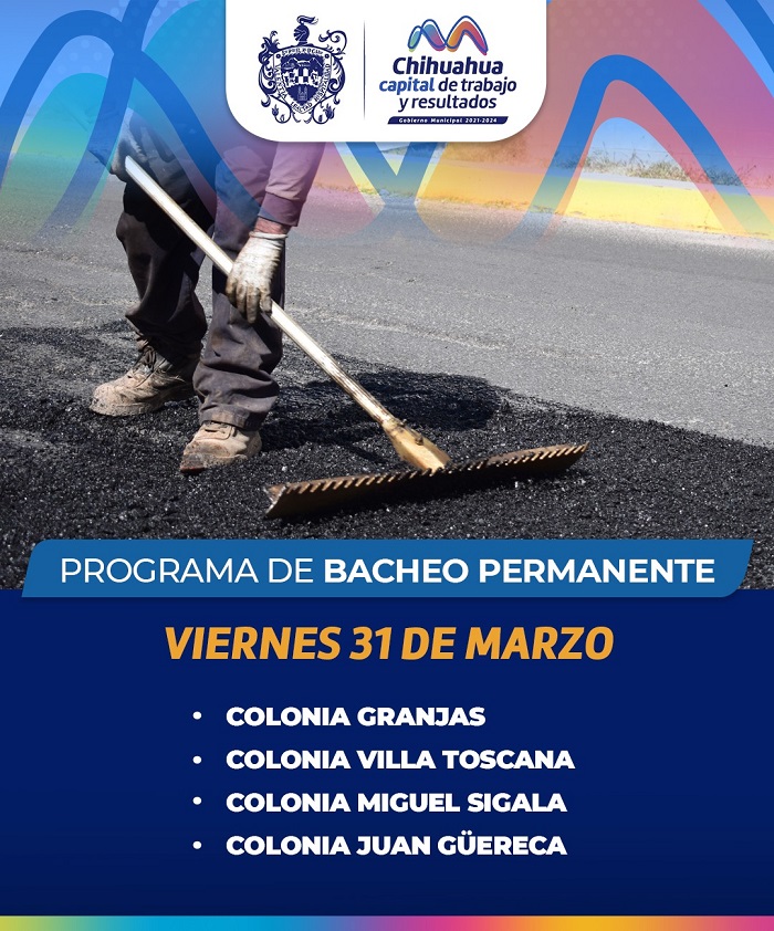 Chihuahua, Chih.- El Gobierno Municipal que encabeza el alcalde Marco Bonilla, a través de la Dirección de Obras Públicas, sigue con el Programa Permanente de Bacheo hoy viernes 31 de marzo para atender de manera eficaz los reportes de baches estará trabajando en cuatro colonias de Chihuahua Capital.