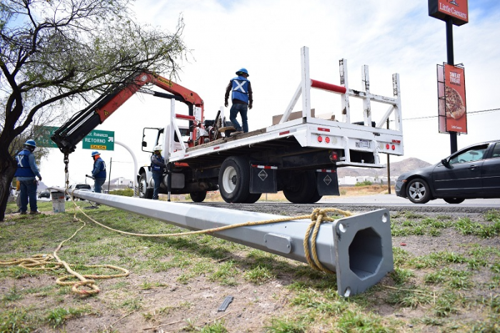 A través de la Dirección de Obras Públicas Municipales, realizan la colocación de bases de concreto, postes y súper postes con lámparas con tecnología LED, para beneficiar a los ciudadanos con alumbrado público en accesos y vialidades principales de Chihuahua.