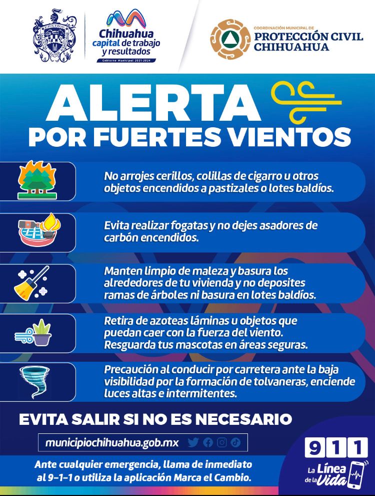 DE LA REDACCIÓNChihuahua. Chih.- La Coordinación Municipal de Protección Civil, reitera la alerta que se tiene por fuertes vientos para este martes 4 de abril, ya que se prevén ráfagas de viento de hasta 75 kilómetros por hora, por lo que se pide atender las recomendaciones que emiten las autoridades para evitar incidentes.