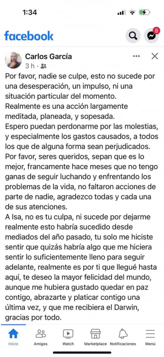 Ayer por la noche se reveló una publicación del abogado fallecido, de nombre Alfonso Carlos García Chico, quien antes de morir, dejó una carta póstuma en la que explicaba los motivos de su suicidio.