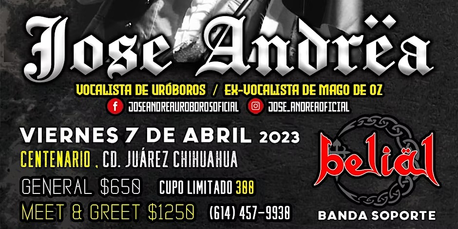 Es necesario resaltar que mañana Jose Andrea dará un atributo a Mago de Oz, ex banda en la que estaba, y en la actual, Uroboros en Ciudad Juárez donde el costo general del boleto será de 650 pesos mientras que el evento donde firmará autografos (Meet & Greet) estará a mil 250 pesos.