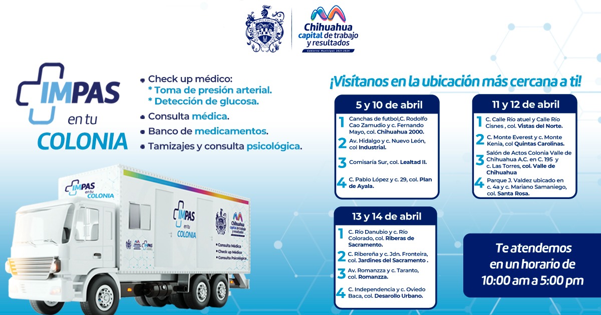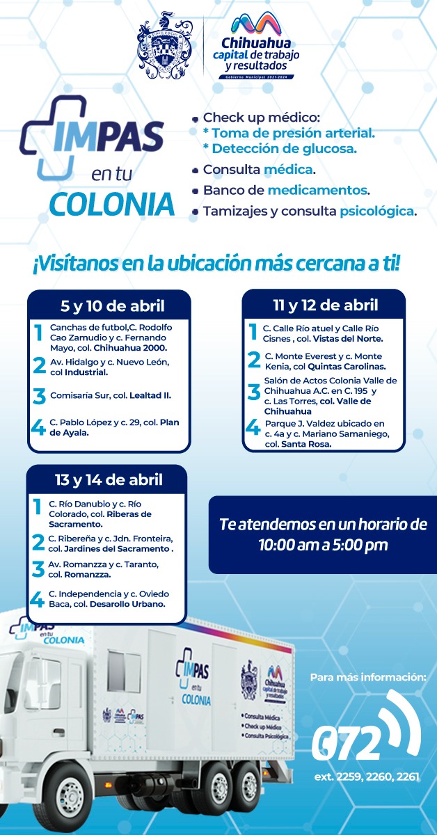 Chihuahua, Chih.- El Instituto Municipal de Prevención y Atención a la Salud (IMPAS), invita a las familias de la Capital a aprovechar los servicios gratuitos en los consultorios móviles del programa “IMPAS en Tu Colonia”, que promueve el cuidado a la salud de las y los chihuahuenses.
