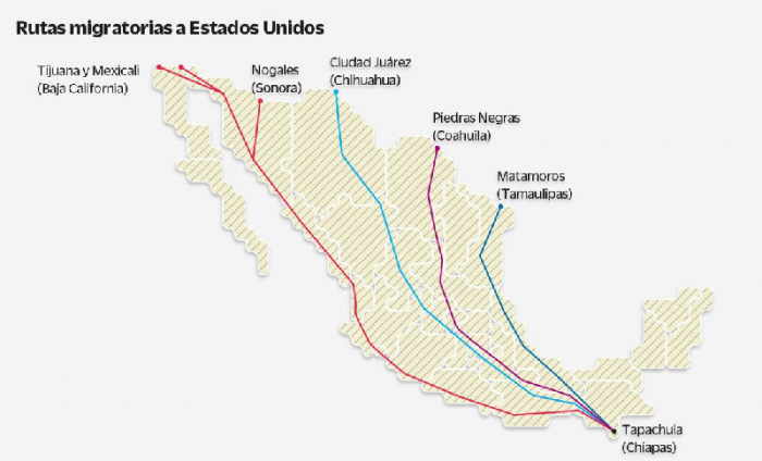 La Secretaría de Gobernación (Segob) tiene detectadas al menos cuatro rutas de tránsito irregular de migrantes: golfo de México, Pacífico-Sur, Centro-Pacífico y Pacífico-Norte.