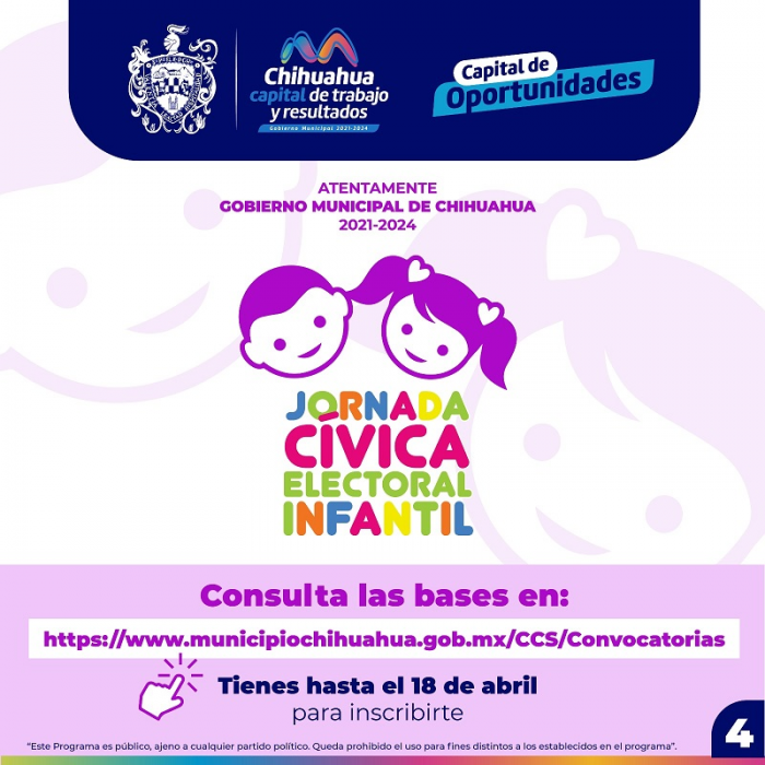 Quienes deseen conocer las bases de la convocatoria pueden ingresar a la siguiente página: https://www.municipiochihuahua.gob.mx/CCS/Convocatorias/Jornada_Civica_Electoral_Infantil_2023