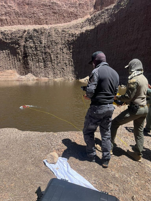 Por las características del lugar, el Grupo Especializado de Búsqueda utilizó drones sumergibles de alta tecnología para inspeccionar los mantos acuíferos que se encuentran en el lugar y documentar las condiciones de los mismos.