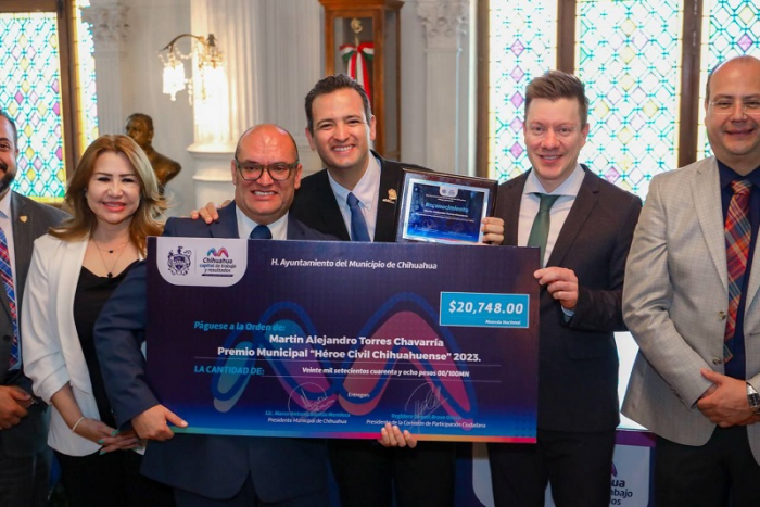 Chihuahua, Chih.- En sesión solemne de Cabildo, el alcalde Marco Bonilla, la Síndica, así como las y los Regidores del H. Ayuntamiento, entregaron el premio “Al Héroe Civil Chihuahuense” en su edición 2023, cuyo ganador fue Martín Alejandro Torres, presidente de la asociación civil "Acción Comunitaria para tu Ciudad".