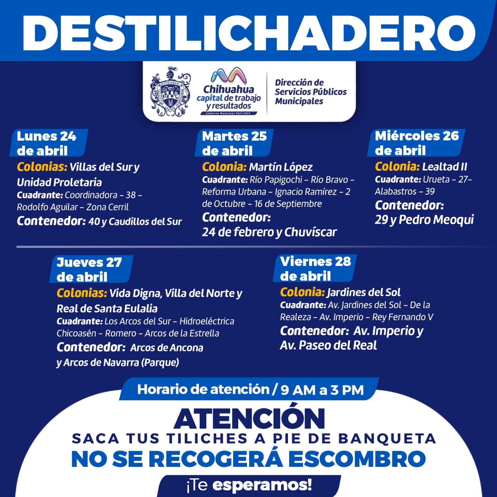 Por FELAChihuahua,Chih. A 22 de abril de 2023.- El Gobierno Municipal de Chihuahua, que encabeza el alcalde Marco Bonilla, a través de la Dirección de Servicios Públicos Municipales, informa a la ciudadanía el calendario del programa Destilichadero que se realizará del 24 al 28 de abril en ocho colonias de Chihuahua Capital.