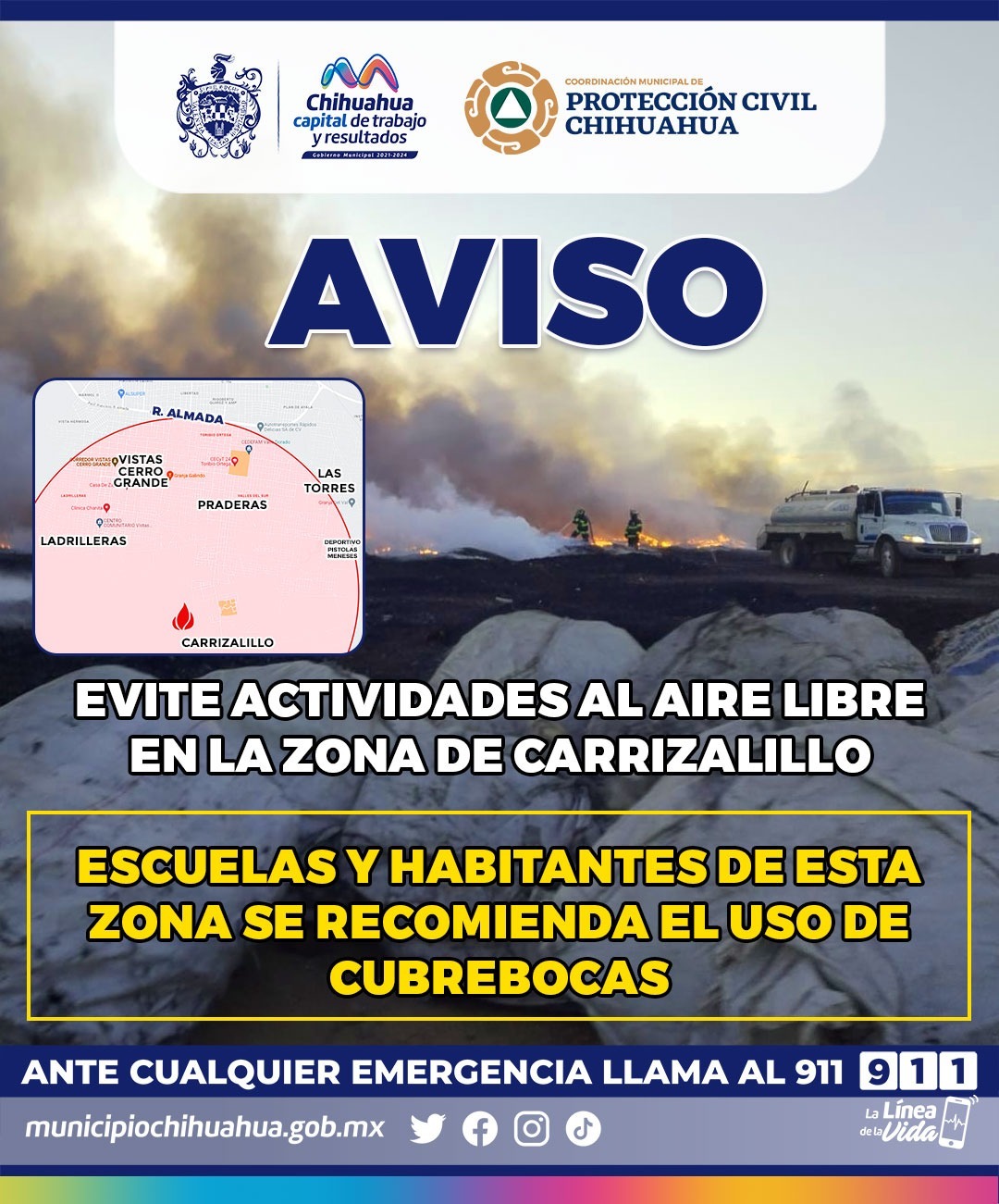 Chihuahua, Chih.- El Gobierno Municipal de Chihuahua, a través de la Coordinación de Protección Civil, llama a la población del sur de la ciudad, en particular a quien se encuentre cerca del ejido de Carrizalillo, donde, desde ayer hay un incendio forestal, a tomar las debidas medidas de precaución, por la emisión de monóxido de carbono en la atmósfera, provocado por la quema del sólido combustible, desechos y residuos en el lugar.