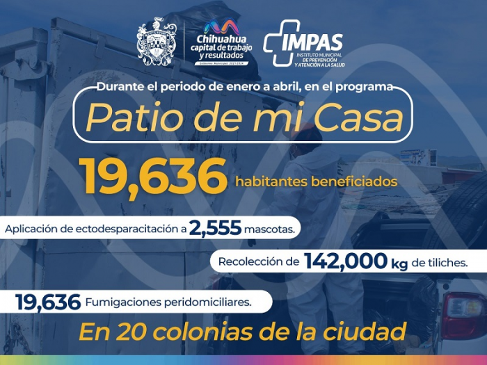 El programa “El Patio de Mi Casa” continúa con intervenciones de manera semanal, por lo que se invita a la población a permanecer atenta de la página de Facebook @ImpasChihuahua, en la que se da a conocer el calendario de intervenciones a realizar durante los meses del año.