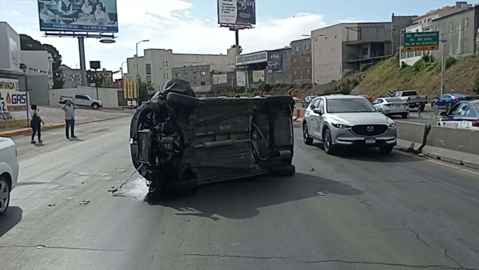 Chihuahua, Chih.- Hace unos momentos se registró una fuerte volcadura sobre la avenida La Cantera, esto luego de que el conductor de una Susuki Ignis perdió el control de la unidad e impactó contra el muro de contención.El conductor al perder el control e impactar contra el muro de contención salió proyectado contra una Nissan Xtrail, por fortuna no hubo personas lesionadas en el lugar.