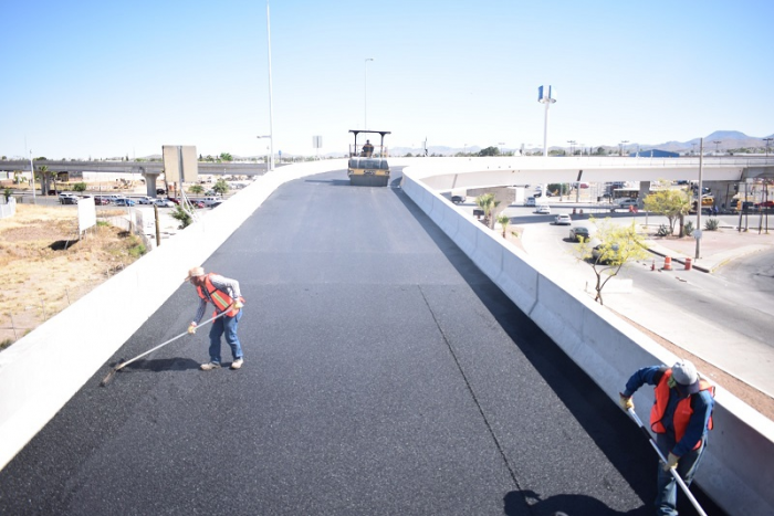 Chihuahua, Chih.- La Dirección de Obras Públicas Municipales inició las labores de colocación de la carpeta asfáltica en los carriles que conforman la infraestructura del Paso Superior del Distribuidor Vial Sur, previendo colocar aproximadamente 14 mil metros cuadrados de este material a lo largo de 880 metros de longitud de este puente, lo cual tiene un registro de avance físico del 90 por ciento en los trabajos ejecutados.