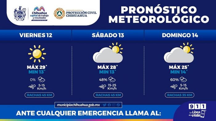 Chihuahua, Chih.- La Coordinación Municipal de Protección Civil, informa a la ciudadanía que este fin de semana, 12 al 14 de mayo, se prevé hasta un 60 por ciento de probabilidad de lluvia para la Capital.