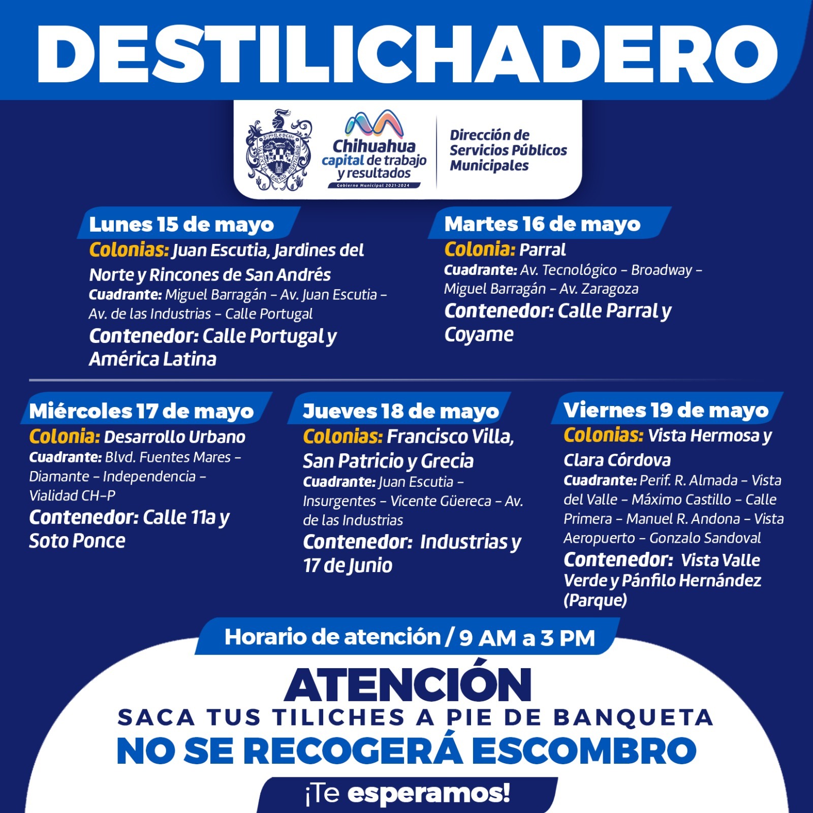 Por FELAChihuahua, Chih.- El Gobierno Municipal de Chihuahua encabezado por Marco Bonilla, a través de la Dirección de Servicios Públicos Municipales, informa a la ciudadanía el calendario del programa Destilichadero que se realizará del 15 al 19 de mayo de abril, en 10 colonias de Chihuahua Capital.