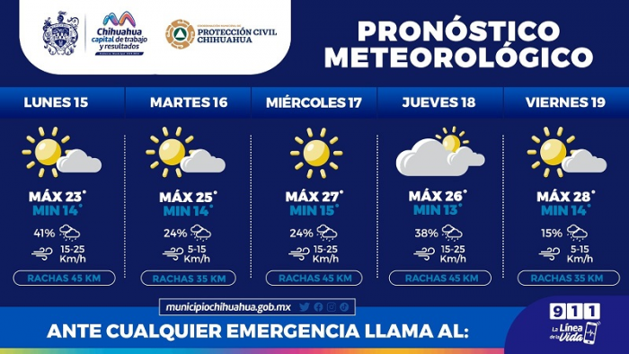 Chihuahua, Chih.- La Coordinación Municipal de Protección Civil, informa a la población que, para la semana del 15 al 19 de mayo , se pronostican temperaturas máximas de 28°C, así como mañanas y noches frescas con mínimas de hasta 13°C y probabilidad de lluvias para toda la semana.