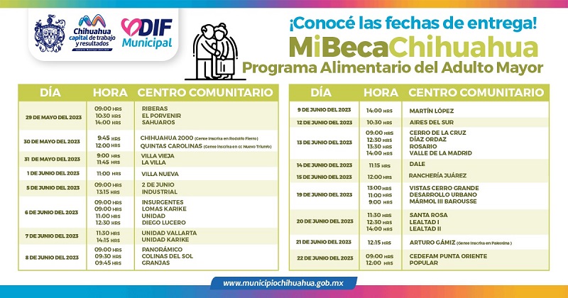 Chihuahua, Chih.- En atención al compromiso que el alcalde Marco Bonilla tiene con las y los adultos mayores de Chihuahua Capital, para garantizarles una mejor calidad de vida, el Gobierno Municipal, a través del DIF, da a conocer las fechas de la segunda entrega del Programa Alimentario del Adulto Mayor 2023.