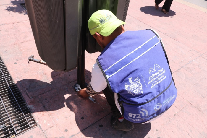 Chihuahua, Chih.- Con el objetivo de mantener una buena imagen urbana, el Gobierno Municipal, a través de la Dirección de Servicios Públicos, trabajan en la reparación de cepos de basura ubicados en el primer cuadro de la ciudad.