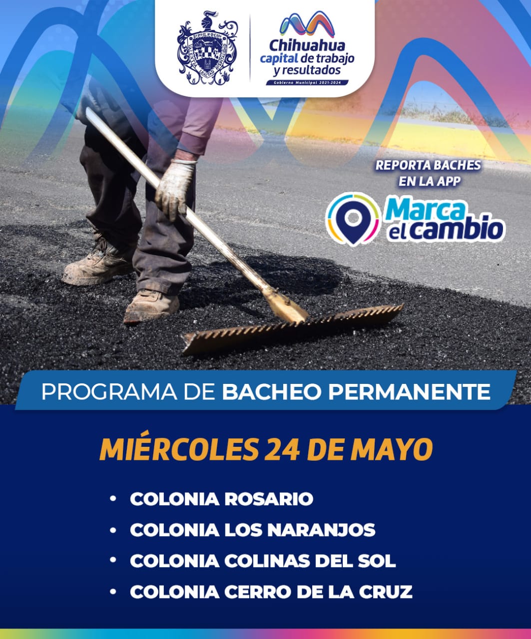 Hoy miércoles 24 de mayo, las cuadrillas de bacheo trabajarán en las colonias Rosario, Los Mezquites, Colinas del Sol y Cerro de la Cruz, por lo que se pide a la ciudadanía transitar con precaución por la zona de trabajos.