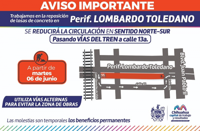 Chihuahua, Chih.- Para mejorar la seguridad a las y los conductores que circulan por el periférico Lombardo Toledano, el Gobierno Municipal que encabeza el alcalde Marco Bonilla, iniciará a partir del 6 de junio la repavimentación del tramo de norte a sur que comprende desde la calle Derecho de Vida hasta la calle 13, por lo que se pide tomar como vía alterna la calle 65.