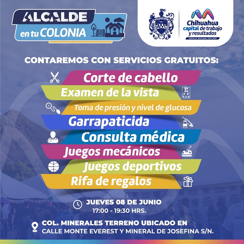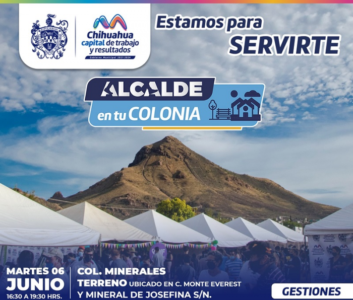Chihuahua, Chih. - Para el alcalde Marco Bonilla es importante mantener un vínculo entre la ciudadanía y el Gobierno Municipal, por ello, la Dirección de Desarrollo Humano y Educación invita a los vecinos de la colonia Minerales en sus distintas etapas, y colonias aledañas, a asistir al evento “Alcalde en tu Colonia” los días 6 y 8 de junio.