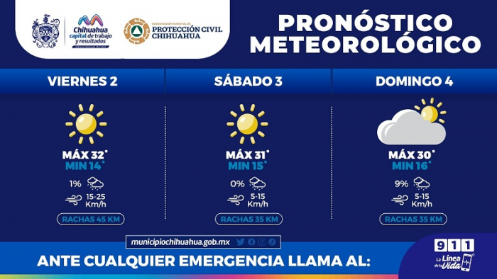 Chihuahua, Chih.- La Coordinación Municipal de Protección Civil, informa que, para este fin de semana, existe una probabilidad de lluvias ligeras para el domingo 4 de junio, así como temperaturas calurosas que alcanzarán hasta los 32°C.
