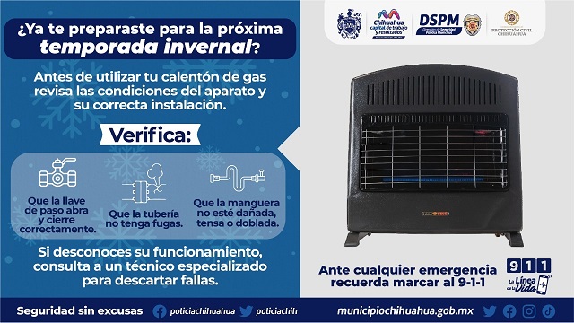Chihuahua, Chih.- Con el objetivo de prevenir accidentes provocados por la deficiente instalación de líneas de gas en calentones, tanques, estufas u otros aparatos que se utilizan en el hogar o en los negocios, el H. Cuerpo de Bomberos pide a los chihuahuenses seguir las siguientes recomendaciones que ayudarán a pasar una temporada invernal sin accidentes.